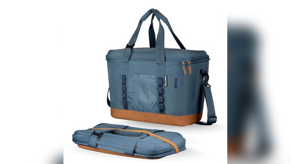 The CleverMade Pacifica Collapsible Cooler is ideal for beach trips. It holds 50 cans, is leakproof, and has a shoulder strap for easy carrying.