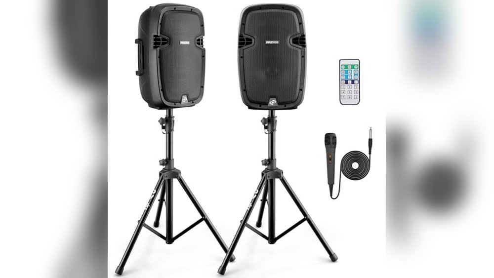 Pyle Wireless Portable PA system - 1000W High Powered Bluetooth Compatible Active + Passive Pair Outdoor Sound Speakers w/ USB SD MP3 AUX - 35mm Mount, 2 Stand, Microphone, Remote - Pyle PPHP1049KT