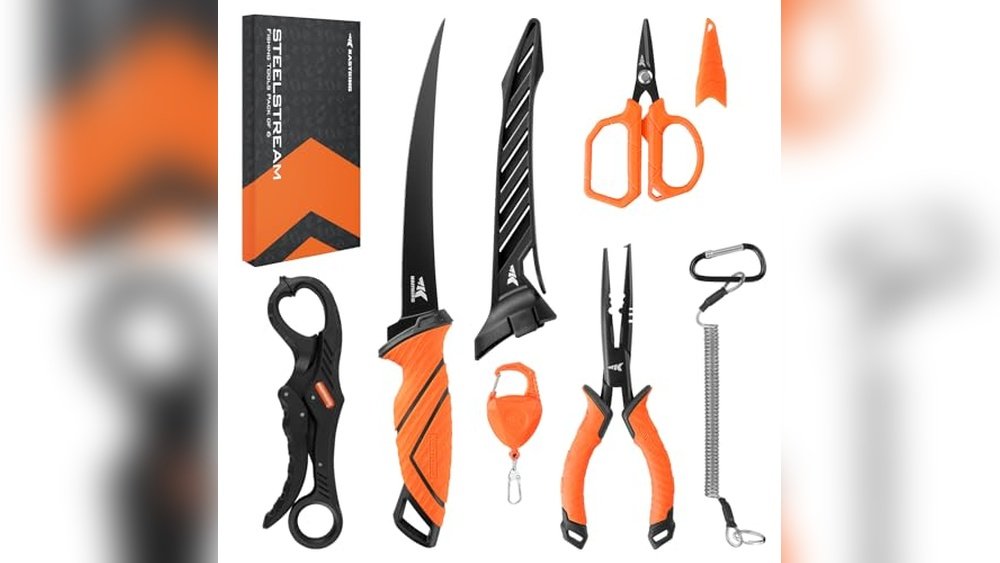 The KastKing SteelStream kit includes corrosion-resistant pliers, a fillet knife, floating fish lip gripper, braid scissors, tool retractor, and a lanyard. It’s designed for durability and convenience during fishing trips.