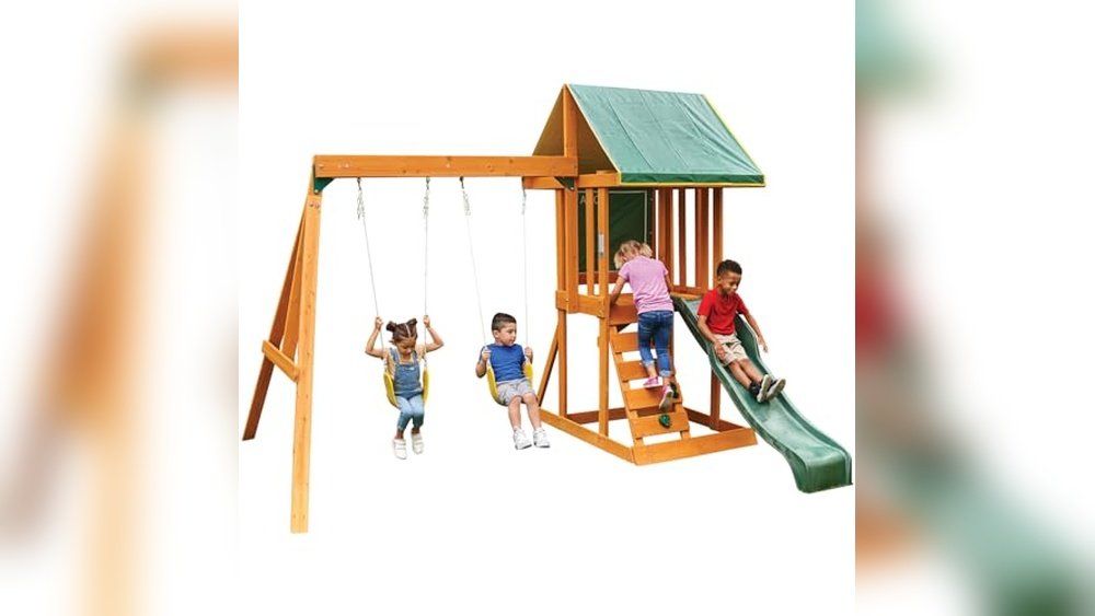 The KidKraft Appleton Swing Set is made from durable, weather-resistant wood. It ensures safety and longevity for outdoor play.