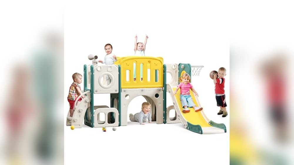 This 8 in 1 Toddler Playset from Garvee combines multiple play activities in one compact unit, encouraging toddlers to explore different movements and skills. The climber and slide promote physical strength and coordination, while the crawling tunnel enhances spatial awareness and motor development. The inclusion of a basketball hoop and telescope sparks imaginative play and hand-eye coordination, catering to various interests and developmental milestones.