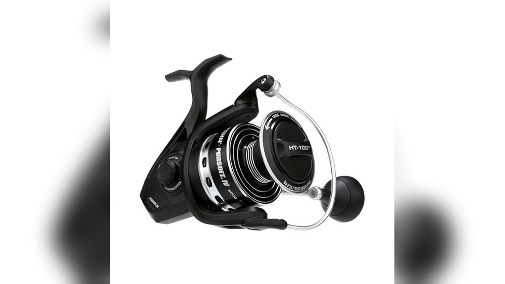 PENN Pursuit IV offers a strong HT-100 front drag system. It has 5 sealed stainless steel ball bearings for smooth performance. Its carbon fiber drag washers ensure durability. The size 8000 model handles up to 25lb, perfect for shore fishing conditions.
